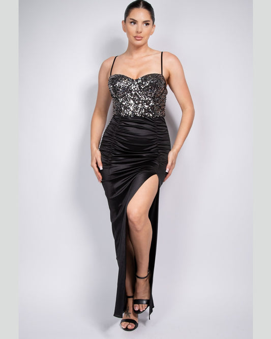 VESTIDO LARGO CON LENTEJUELAS, FALDA SATINADA CON ABIERTA HMD14204