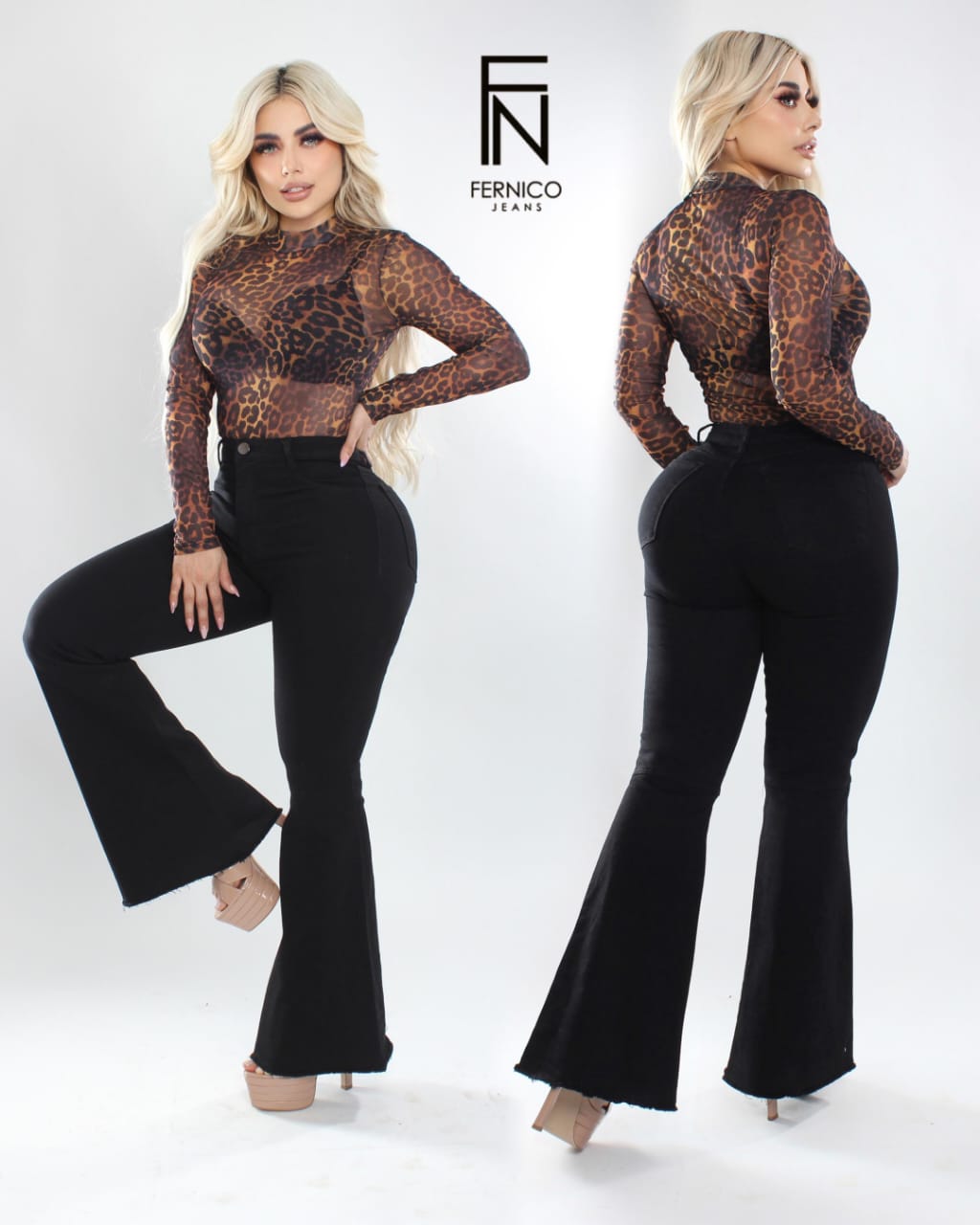 PANTALÓN ACAMPANADO DE MEZCLILLA COLOR NEGRO DE TIRO ALTO CON UN SOLO BOTÓN Y BOLSAS