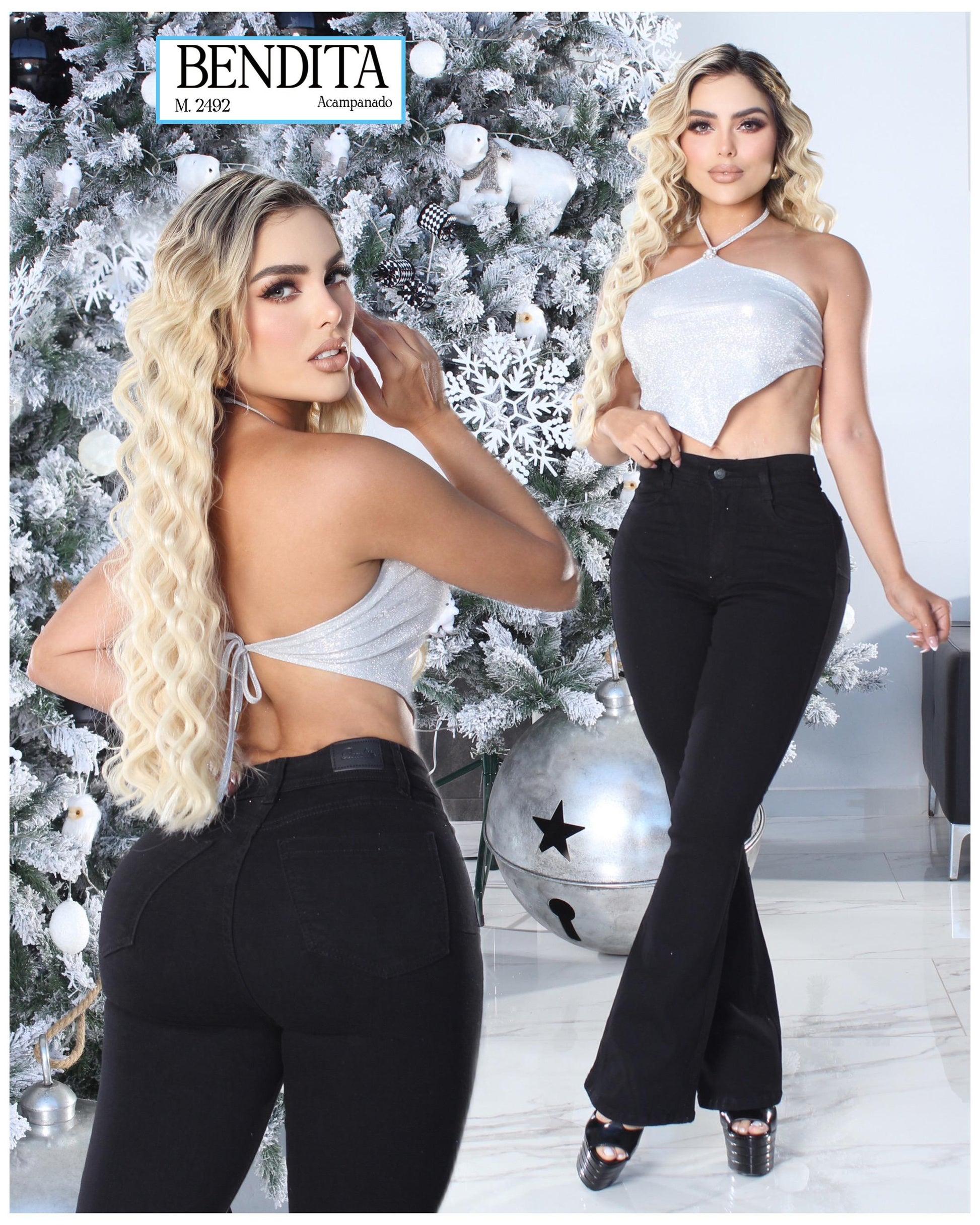 PANTALÓN ACAMPANADO DE MEZCLILLA STRETCH COLOR NEGRO CON BOLSAS, DE TIRO ALTO Y UN SOLO BOTÓN BENDITA 2492