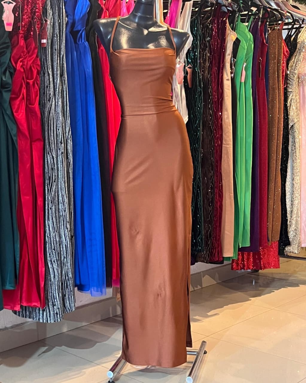 VESTIDO TERRACOTA LARGO DE TIRANTES CON ABERTURA LATERAL