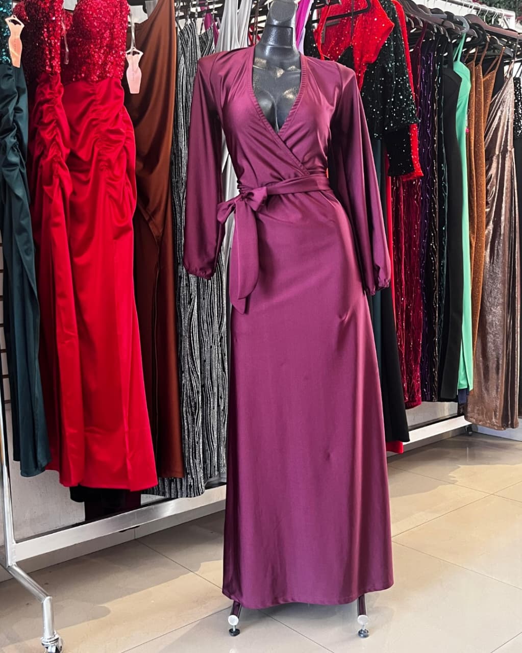 VESTIDO TINTO LARGO CON ESCOTE CRUZADO, MAGA LARGA Y FALDILLA LÍNEA A