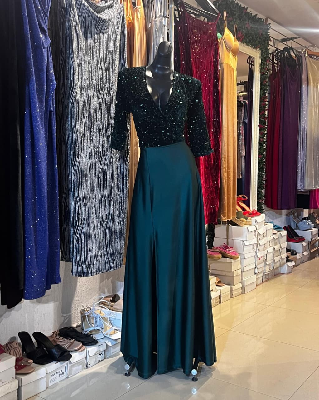 VESTIDO VERDE ESMERALDA CON LENTEJUELAS EN EL PETO, ESCOTE CRUZADO Y FALDILLA EN LÍNEA A CON AVERTURA